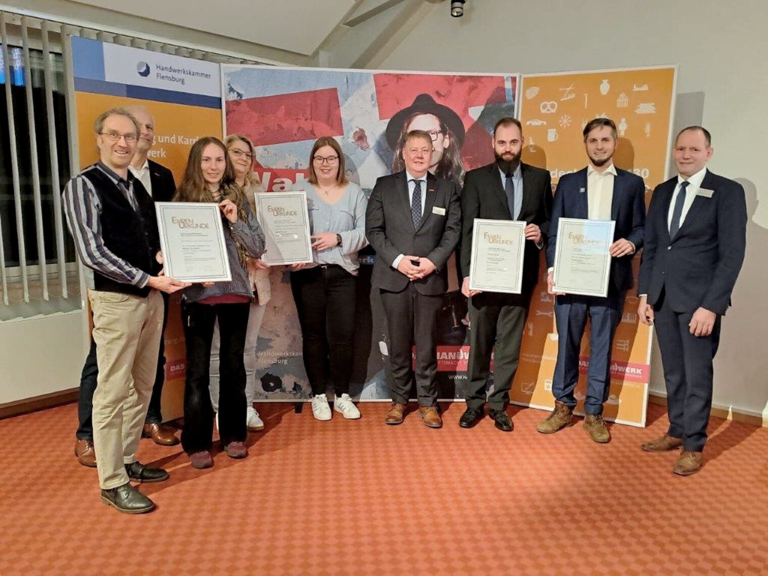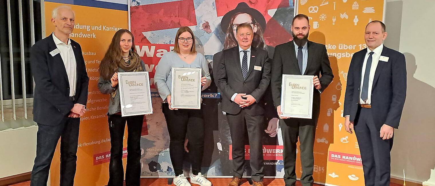 Flensburg. Ende 2022 fanden bundesweit die Vergleichswettkämpfe des besten Nachwuchses in den verschiedenen Handwerksberufen statt. Dabei erreichten fünf Nachwuchskräfte aus dem Kammerbezirk Flensburg Spitzenplätze. Eine Leistung, die Kammerpräsident Jörn Arp mit einer Feierstunde würdigte.
