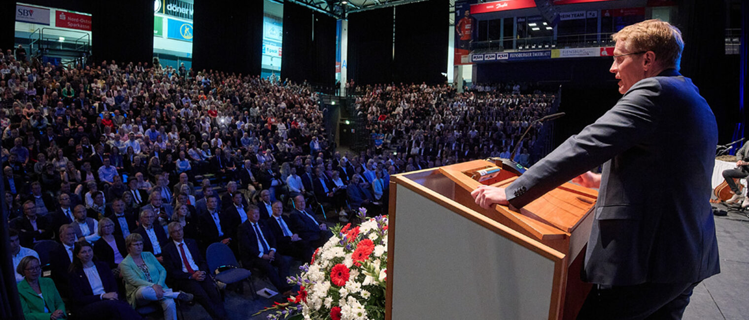 Zu den ersten Gratulanten vor rund 1.600 Gästen zählte Ministerpräsident Daniel Günther, der auch an der persönlichen Überreichung der Meisterbriefe teilnahm. Er freue sich sehr, die Leistung des Handwerks-Nachwuchses zu würdigen, betonte dabei der Ministerpräsident. „Die Meisterausbildung ist eine der schwersten und besten Fortbildungen, die man machen kann. Darauf können Sie stolz sein.“ Für Schleswig-Holstein sei das Handwerk von großer Bedeutung, sagte Günther. „Momentan gehen wir durch eine herausfordernde Zeit. Das Handwerk meistert diese Krisen sprichwörtlich. Es wird immer gebraucht, sowohl bei den Dingen des täglichen Lebens, als auch bei der Bewältigung der großen Aufgaben Energiewende und Klimaschutz.“ Die Handwerkerinnen und Handwerker in Schleswig-Holstein seien „aktive Zukunftsgestalter und berufliche Klimaschützer“, betonte Günther und nannte beispielhaft die Errichtung von Windparks, die Modernisierung von Heizungen und energieeffizientes Bauen und Sanieren von Häusern. „Das zeigt, wie wichtig das Handwerk für unser Land ist.“