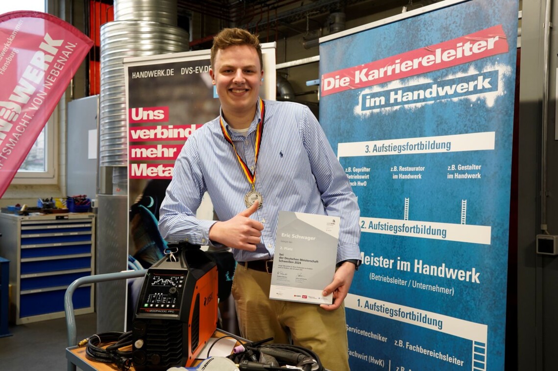 Eric Schwager aus Sterup ist einer der Besten. Nachdem er 2023 beim Landeswettbewerb „Jugend schweißt“ in Flensburg den ersten Platz im WIG-Schweißen belegte, gelang ihm der gleiche Erfolg auf Landesebene. Beim Bundeswettbewerb in Essen erreichte er einen verdienten vierten Platz und qualifizierte sich damit für die Deutsche Meisterschaft 2024 im Schweißen in Frankfurt am Main. Dort konnte er sich dann mit einem hart erkämpften zweiten Platz durchsetzen. „Das war eine harte Woche und wir haben täglich mehrere Stunden geschweißt. Da kommt man schon ins Schwitzen“, sagt Schwager.