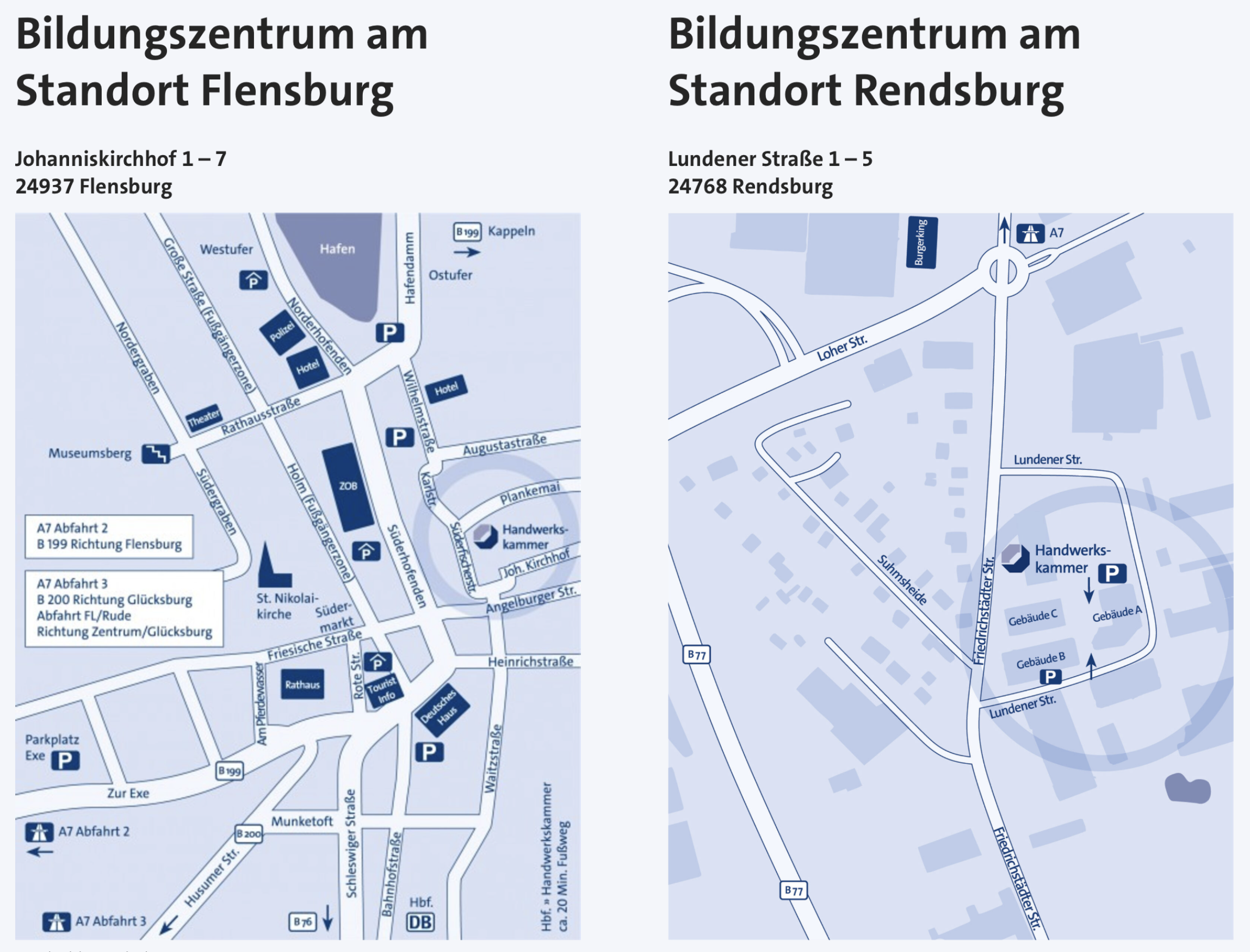 Unser Bildungszentrum in Flensburg liegt zentral in Hafennähe und bietet Ihnen eine ideale Lernumgebung in einer der schönsten Städte Schleswig-Holsteins. Nutzen Sie die ruhige und dennoch gut angebundene Lage, um sich ganz auf Ihre handwerkliche Ausbildung oder Fortbildung zu konzentrieren.